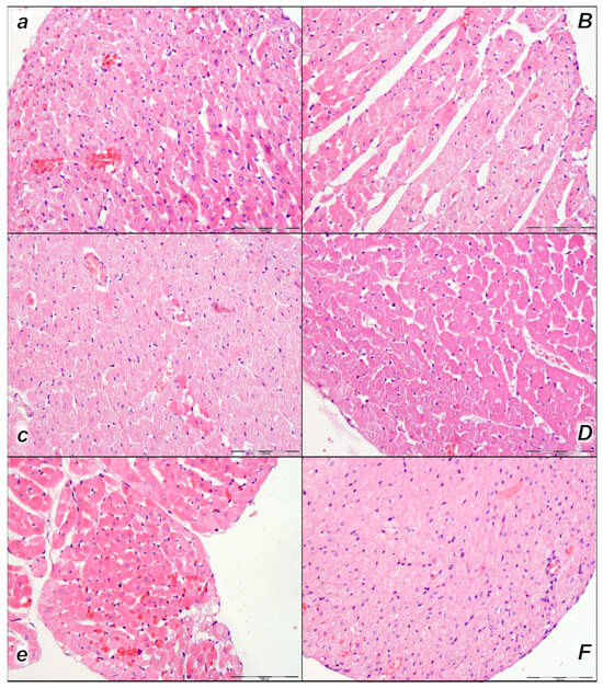 The same scoring system as in our previous studies [,,,,,,,,,,,,,,,,] was used to grade renal (i.e., the degeneration of Bowman’s space and glomeruli, degeneration of the proximal and distal tubules, vascular congestion, and interstitial edema), liver (i.e., vacuolization of hepatocytes and pyknotic hepatocyte nuclei, activation of Kupffer cells, and enlargement of sinusoids), and heart (i.e., dilatation and congestion of blood vessels within the myocardium and coronary arteries) histology. Each specimen was scored using a scale ranging from 0–3 (0—none; 1—mild; 2—moderate; and 3—severe) for each criterion, and a final histology score was determined (0—none; 1—mild; 2—moderate; and 3—severe).