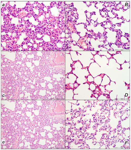 Lung, microscopy presentation (a–F). In the control rats, within-lung parenchyma thickening of the alveolar membranes was observed due to capillary congestion, pulmonary edema, and dilatation of larger blood vessels (small italic letters) at 15 min (a), 30 min (c), and 60 min (e) after laurate application into the inferior caval vein. No changes in BPC 157-treated rats were observed (capital italic letters) at 15 min (B), 30 min (D), and 60 min (F) after laurate application into the inferior caval vein. (HE staining; magnification 400×; scale bar 100 μm).