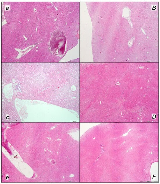 Liver, microscopy presentation (a–F). In liver parenchyma, pronounced dilatation of sinusoids and branches of the portal vein in portal tracts was found in liver tissue of control rats (small italic letters) at 15 min (a), 30 min (c), and 60 min (e) after laurate application into the inferior caval vein. No changes in BPC 157-treated rats (capital italic letters) were observed at 15 min (B), 30 min (D), and 60 min (F) after laurate application into the inferior caval vein. (HE staining; magnification 400×; scale bar 100 μm).