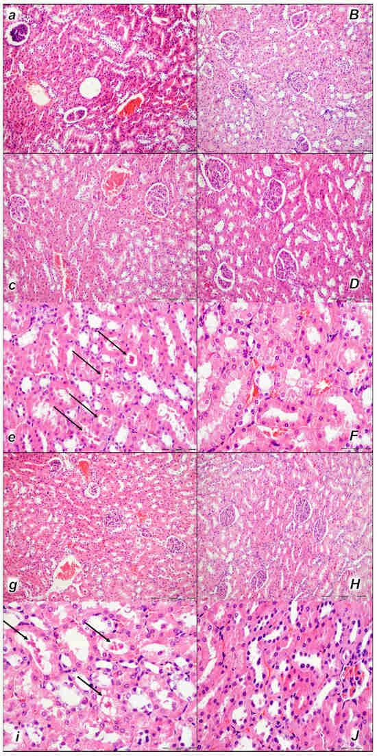 Kidney, microscopy presentation (a–F). After laurate application into the inferior caval vein control rats (small italic letters), moderate vascular congestion was shown in renal parenchyma, interstitial edema at 15 min (a), and moderate vascular congestion, and interstitial edema, and intratubular hyaline casts (black arrows) at 30 min (c,e) and at 60 min (g,i). No changes in BPC 157-treated rats (capital italic letters) were observed at 15 min (B), 30 min (D,F), and 60 min (H,J) after laurate application into the inferior caval vein. (HE staining; magnification 200×; scale bar 200 μm (a,B,c,D,g,H); magnification 600×; scale bar 50 μm (e,F,i,J)).