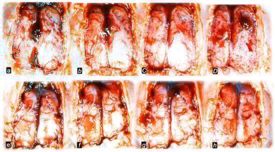 Gross brain presentation in healthy rats (normal small letters) and then after laureate application into inferior caval vein (italic letters), and subsequent application of the BPC 157 therapy (capital italic letters) or saline (small italic letters) (a–h). Brain presentation in normal healthy rats (a,e), brain swelling presentation immediately upon laurate application (b,f). Then, there was the opposite effect of therapy: decreased brain swelling immediately upon BPC 157 administration (C), decreased brain swelling in BPC 157-treated rats immediately before sacrifice (D), in contrast to further brain swelling immediately upon saline administration (g) and increased brain swelling in saline-treated rats immediately before sacrifice (h). A similar presentation was noted with both intragastric and intraperitoneal BPC 157 therapy.
