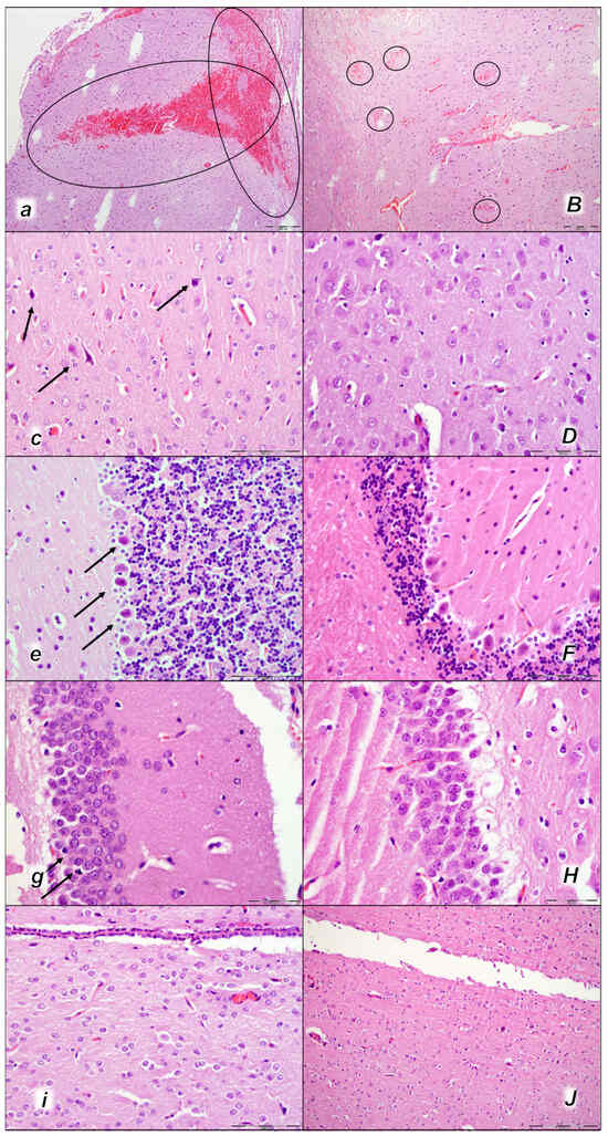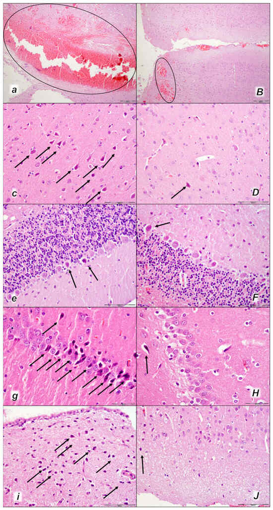 Brain neuropathological changes 30 min following laurate application into the inferior caval vein (a–J). In the control rats (italic small letters), a pronounced edema and congestion in the brain tissue were observed. Focal, pronounced, and deep intracerebral hemorrhage involving areas of brain tissue was observed, affecting areas of the neocortex, the corpus callosum, the amygdala, and the striatum in the brain tissue (a) (marked area). Moderate and severe neurodegenerative changes of the central nervous system, such as rare karyopyknotic cells affecting the cerebral (c) and cerebellar (e) cortex, a karyopyknosis and degeneration of the Purkinje cells of the cerebellar cortex, and karyopyknosis of cortical neurons, were observed (black arrows), as well as karyopyknosis of cortical neurons, hypothalamic neurons (g), and pyramidal cells of the hippocampus (i) (black arrows). In the BPC 157-treated rats (capital italic letters), only mild edema and congestion in the brain tissue were observed. Intracerebral hemorrhage was visible only within superficial layers of the neocortex (marked area) (B). BPC 157-treated rats presented no or only rare karyopyknotic cells in all four regions: the cerebrum (D), cerebellum (F), hypothalamus/thalamus (H), and hippocampus (J). (HE staining; magnification 100×; scale bar 200 µm (a,B); magnification 400×; scale bar 100 µm (c–J)).