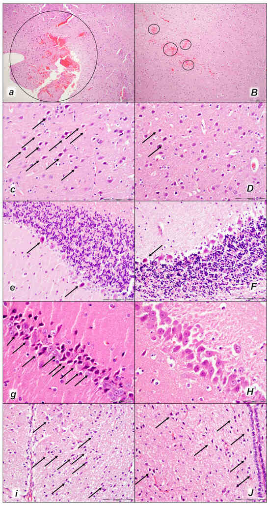 Brain neuropathological changes 60 min following laurate application into the inferior caval vein (a–J). In the control rats (small italic letters), a pronounced edema and congestion in the brain tissue were observed. Focal, pronounced, and deep intracerebral hemorrhage involving areas of brain tissue was observed, affecting areas of the neocortex, the corpus callosum, the amygdala, and the striatum in the brain tissue (a) (marked area). Moderate and severe neurodegenerative changes of the central nervous system, such as rare karyopyknotic cells affecting the cerebral (c) and cerebellar (e) cortex, a karyopyknosis and degeneration of the Purkinje cells of the cerebellar cortex, and karyopyknosis of cortical neurons, were observed (black arrows), as well as karyopyknosis of cortical neurons, hypothalamic neurons (g), and pyramidal cells of the hippocampus (i) (black arrows). In the BPC 157-treated rats (capital italic letters), mild edema and congestion in the brain tissue were observed. Intracerebral hemorrhage was visible only within superficial layers of the neocortex (marked area) (B). BPC 157-treated rats presented no or only rare karyopyknotic cells in all four regions: the cerebrum (D), cerebellum (F), hypothalamus/thalamus (H), and hippocampus (J). ((HE staining; magnification 100×; scale bar 200 µm (a,B); magnification 400×; scale bar 100 µm (c–J)).