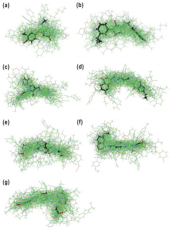 Achieving an accurate 3D-QSAR prediction model relies critically on the precise 3D structural alignment of molecules within a dataset. Because only a small deviation from the perfect molecular superposition may cause a large error in predicting the physicochemical properties [30], 3D molecular alignment has been considered the most problematic bottleneck in 3D-QSAR modeling. While the majority of molecular alignment techniques involve superimposing similar chemical groups, there have been innovative approaches proposed to align entire molecular structures by leveraging the 3D distribution of physicochemical properties [31,32,33,34]. We used the alignment method termed AlphaQ [35], in which pairwise 3D structural alignments were carried out by optimizing the Eij values in relation to the template molecule. This method has distinct advantages over the conventional ones in handling structurally diverse molecules without identical chemical moiety because the calculation of Eij values on the fully quantum mechanical basis adds a layer of accuracy and sophistication to the approach. Figure 1 illustrates the outcomes of the 3D structural alignments within each molecular subset. The concentration of core structures in the central region across all seven cases suggests a consistent pattern in the alignment of molecules within each subset. The variations in sidechain orientations may provide valuable information about the structural diversity of the compounds. These 3D structural alignments cannot be scored quantitatively like the conventional atom-by-atom matching protocol because no common molecular core is present. Therefore, it would be desirable to assess the accuracy of the alignments with the predictive capabilities of 3D-QSAR prediction models derived from the optimized molecular atomic coordinates.