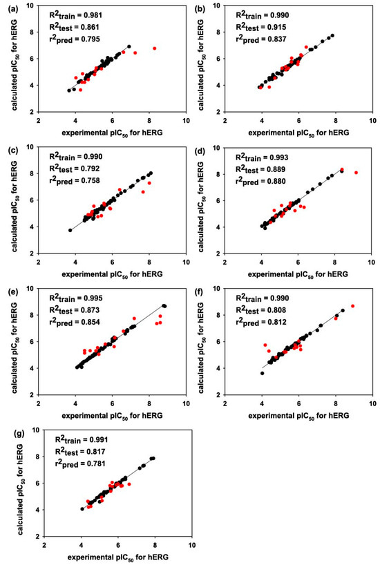 Correlation diagrams illustrating the relationship between experimental and calculated hERG pIC50 values for (a) Subset 1, (b) Subset 2, (c) Subset 3, (d) Subset 4, (e) Subset 5, (f) Subset 6, and (g) Subset 7. Molecules in the training set are marked with black circles, while those in the test set are highlighted with red circles.