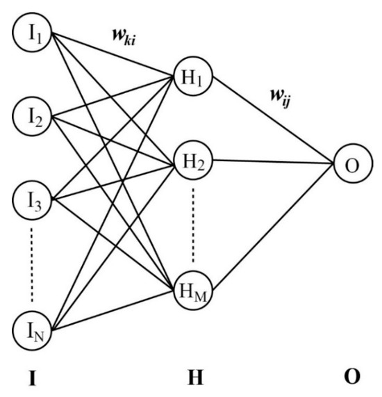 Schematic diagram of N × M × 1 neural network to derive a 3D-QSAR model for predicting the pIC50 data of hERG blockers. Column I, H, and O denote the input, hidden, and output layer, respectively. Neurons in these three layers are interconnected through the weighting matrices wki and wij.