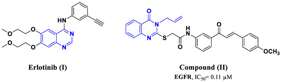 Nitrogen-based heterocycle molecules are a useful source of necessary building blocks for developing novel bioactive chemicals. N-Heterocyclic components are found in over three-quarters of the medications approved by the Food and Drug Administration (FDA) [32]. Quinazoline and quinazolin-4-one are crucial nitrogen-based heterocycles that have been extensively researched in numerous research activities revealing their adaptive biological effects [33,34]. These chemically basic compounds possess a wide range of medicinal properties, such as anti-cancer [33,35], anti-tubercular [36], anti-inflammatory [37], and antimicrobial activities [38]. Many quinazoline-based anti-cancer agents were granted FDA approval and are in clinical use for cancer management, such as Erlotinib (I) (Figure 1), demonstrating remarkable potency in inhibiting growth factor receptor tyrosine kinases, particularly targeting the EGFR receptor, and featuring quinazoline scaffolds [39]. Its anti-cancer effectiveness stems from its ability to hinder intracellular phosphorylation of tyrosine kinases at the ATP binding site of the receptor, block JAK2V617F—a mutant variant of JAK2, and initiate pathways that lead to apoptotic cell death [40]. Despite its notable efficacy, specificity, and favorable safety record, patients frequently acquire resistance to this treatment within 8–12 months of initiating therapy due to mutations occurring in the ATP binding site of the EGFR kinase domain [41]. In our recent publication, compound (II) with a quinazolin-4-one nucleus had robust antitumor activity against four cancer cell lines, as well as significant dual EGFR and BRAFV600E inhibitory action (IC50 = 0.11 µM and 0.65 µM, respectively) (Figure 1) [33].
