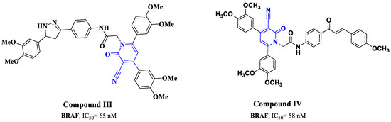 Cyanopyridine derivatives have exhibited favorable characteristics in terms of antimicrobial [42], antioxidant [43], antibiotic [44], anti-inflammatory [45], anticonvulsant [46], as well as anti-cancer potential [47,48]. Because of their potential to interact with a variety of biological targets, including tubulin [49], the survivin protein [50,51], and PIM-1 Kinase [52,53], these compounds have received much interest for their anti-cancer characteristics. In our recent publication, 3-cyanopyridone/pyrazoline hybrid III (Figure 2) exhibited impressive dual inhibitory efficacy against EGFR and BRAF V600E (IC50 = 68, 65 nM, respectively), with remarkable GI50 values of 25 nM. Like Erlotinib, compound III displayed a potent inhibitor especially against both cancer cell proliferation and BRAFV600E [54]. In another study, compound IV (Figure 2) demonstrated significant efficacy in inhibiting cancer cell proliferation (with a GI50 value of 0.72 µM) and promising inhibitory potential against BRAFV600E (with an IC50 value of 58 nM), outperforming Erlotinib (with an IC50 value of 65 nM) [47].