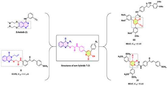 As a result, a novel series of quinazolin-4-one/3-cyanopyridin-2-one hybrids (7–21, Figure 3) were developed and synthesized as dual EGFR/BRAFV600E inhibitors with antiproliferative activity. The newly synthesized compounds were evaluated against a panel of four human cancer cell lines. The most potent compounds were then investigated as EGFR and BRAFV600E inhibitors. Finally, molecular docking studies were carried out to evaluate their binding mechanisms and interactions inside the active sites of molecular targets.