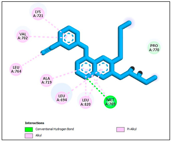 To validate the reliability of the EGFR docking procedure, we conducted a re-docking experiment using the co-crystallized Erlotinib. This was performed within the active site of EGFR, resulting in a S score of −8.69 kcal/mol. The root-mean-square deviation (RMSD) value, a structural similarity measure, was calculated to be 1.72 Å. A significant hydrogen bond interaction was established, specifically between the pyrimidine nitrogen of Erlotinib and the amino acid Met769, with a bond length of 2.29 Å. This interaction emphasized the pivotal role of Met769 in stabilizing the ligand within the binding site Figure 4.