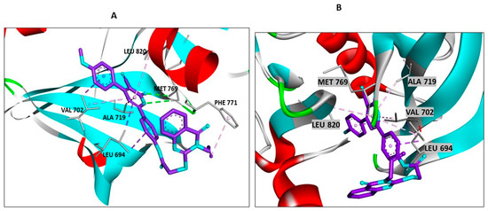 Docking representation models of compounds 18 and 19 within the binding site of EGFR (PDB ID: 1M17); (A) 3D-docked model of compound 18; (B) 3D-docked model of compound 19.