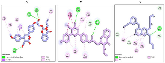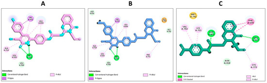 Docking representation models of compound 18, 19, and Erlotinib within the binding site of BRAF (PDB ID: 3OG7); (A) 2D-docked model of compound 18; (B) 2D-docked model of compound 19; (C) 2D-docked model of compound Erlotinib.
