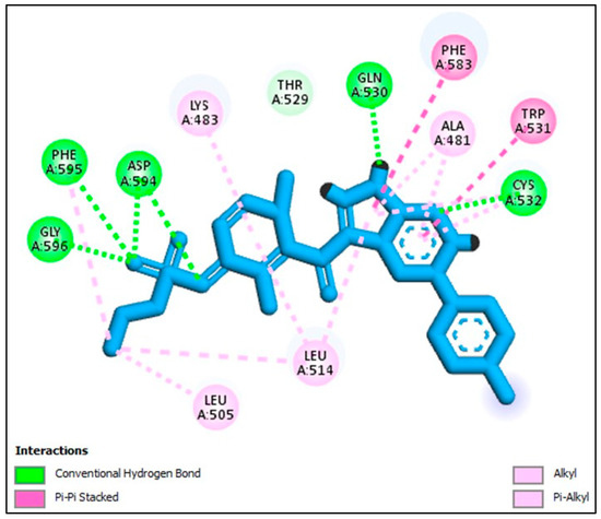 Similarly, to validate the docking protocol concerning BRAFV600E, we conducted a re-docking experiment utilizing the co-crystallized Vemurafenib. This endeavor took place at active site of BRAFV600E, resulting in an impressive S score of −11.99 kcal/mol. To gauge the extent of structural conformity, we computed a root-mean-square deviation (RMSD) value of 1.55 Å. Substantial hydrogen bond interactions were established, particularly between Vemurafenib and the amino acids Cys532 and Asn580, firmly anchoring its position within the binding site (Figure 7).