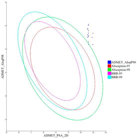 During the ADMET assessment, all the newly synthesized hybrids were categorized at a blood–brain barrier (BBB) level of 4, effectively hindering their ability to penetrate across the BBB. Importantly, the drug bioavailability was interconnected with the fundamental property of 2D polar surface area (ADMET 2D PSA).