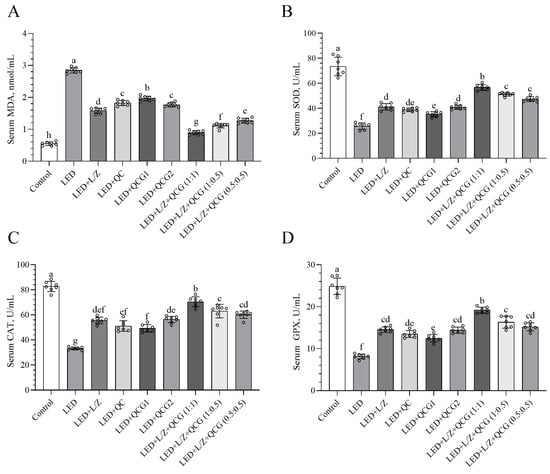 Effect of lutein/zeaxanthin (L/Z) and quercetagetin (QCG) on serum malondialdehyde (MDA, Panel (A)); superoxide dismutase (SOD, Panel (B)); catalase (CAT, Panel (C)); and glutathione peroxidase (GPX, Panel (D)) levels in LED-induced retinal damage in rats. The depicted bars and error lines represent mean ± standard deviation for groups. Different small letters (a–h) above the bars indicate statistical differences between groups. There is no difference between groups with the same letter, whereas there is a difference between groups with entirely different letters (n = 7, ANOVA and Bonferroni’s multiple comparisons test; p < 0.05). The pairwise comparison is presented in Table S1.
