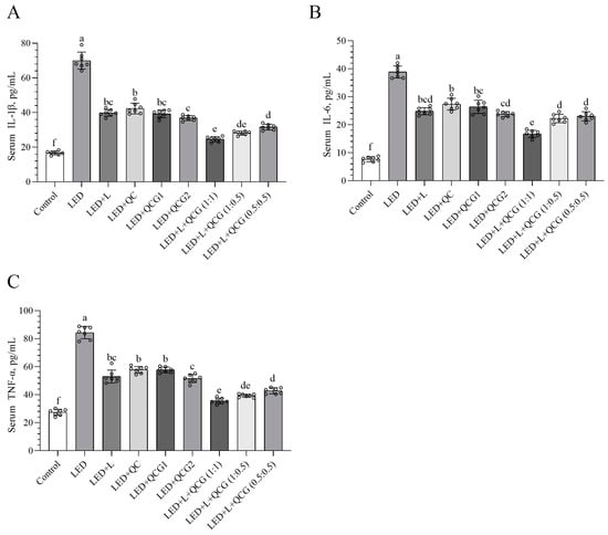 Effect of lutein/zeaxanthin (L/Z) and quercetagetin (QCG) on serum interleukin-1β (IL-1β, Panel (A)); IL-6 (Panel (B)); and tumor necrosis factor-α (TNF-α, Panel (C)) levels in LED-induced retinal damage in rats. The depicted bars and error lines represent mean ± standard deviation for groups. Different small letters (a–f) above the bars indicate statistical differences between groups. There is no difference between groups with the same letter, whereas there is a difference between groups with entirely different letters (n = 7, ANOVA and Bonferroni’s multiple comparisons test; p < 0.05). The pairwise comparison is presented in Table S2.