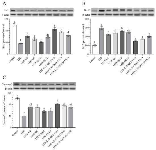 Effect of lutein/zeaxanthin (L/Z) and quercetagetin (QCG) on retinal Bcl-2-associated X protein (Bax, Panel (A)); B-cell lymphoma 2 (Bcl-2, Panel (B)); and cysteine–aspartic acid protease-3 (Caspase-3, Panel (C)) levels in LED-induced retinal damage in rats. β-actin was used to ensure equal protein amounts. The Western blot bands’ intensity is represented according to the percent of the control group. A representative blot is shown in each panel. The depicted bars and error lines represent mean ± standard deviation for groups. Different small letters (a–h) above the bars indicate statistical differences between groups. There is no difference between groups with the same letter, whereas there is a difference between groups with entirely different letters (n = 7, ANOVA and Bonferroni’s multiple comparisons test; p < 0.05). The pairwise comparison is presented in Table S3.