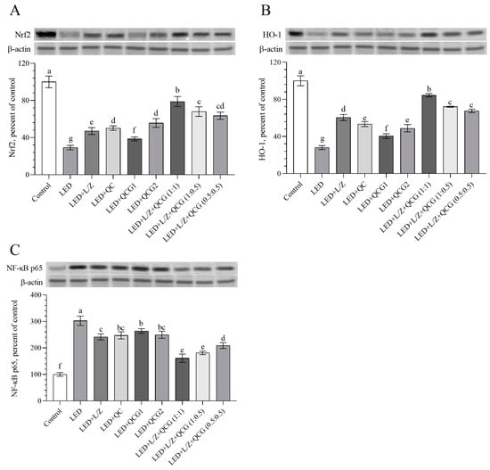 Effect of lutein/zeaxanthin (L/Z) and quercetagetin (QCG) on retinal nuclear factor erythroid 2-related factor 2 (Nrf2, Panel (A)); heme oxygenase-1 (HO-1, Panel (B)); and nuclear factor kappa B p65 subunit (NF-κB p65, Panel (C)) levels in LED-induced retinal damage in rats. β-actin was used to ensure equal protein amounts. The Western blot bands’ intensity is represented according to the percent of the control group. A representative blot is shown in each panel. The depicted bars and error lines represent mean ± standard deviation for groups. Different small letters (a–g) above the bars indicate statistical differences between groups. There is no difference between groups with the same letter, whereas there is a difference between groups with entirely different letters (n = 7, ANOVA and Bonferroni’s multiple comparisons test; p < 0.05). The pairwise comparison is presented in Table S4.