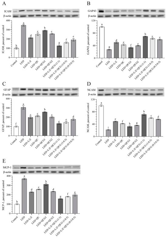 Effect of lutein/zeaxanthin (L/Z) and quercetagetin (QCG) on retinal intercellular adhesion molecule-1 (ICAM, Panel (A)); growth-associated protein-43 (GAP43, Panel (B)); glial fibrillary acid protein (GFAP, Panel (C)); neural cell adhesion molecule (NCAM, Panel (D)); and monocyte chemoattractant protein 1 (MCP-1, Panel (E)) levels in LED-induced retinal damage in rats. β-actin was used to ensure equal protein amounts. The Western blot bands’ intensity is represented according to the percent of the control group. A representative blot is shown in each panel. The depicted bars and error lines represent mean ± standard deviation for groups. Different small letters (a–i) above the bars indicate statistical differences between groups. There is no difference between groups with the same letter, whereas there is a difference between groups with entirely different letters (n = 7, ANOVA and Bonferroni’s multiple comparisons test; p < 0.05). The pairwise comparison is presented in Table S5.