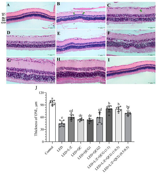 Effect of lutein/zeaxanthin (L/Z) and quercetagetin (QCG) on retinal histopathology [Control, Panel (A); LED Panel (B); LED + L/Z, Panel (C); LED + QC, Panel (D); LED + QCG1, Panel (E); LED + QCG2, Panel (F); LED+ L/Z + QCG (1:1) Panel (G); LED+ L/Z + QCG (1:0.5) Panel (H); LED+ L/Z + QCG (0.5:0.5), Panel (I)] and outer nuclear layer (ONL, Panel (J)) thickness in LED-induced retinal damage in rats. Representative images are shown (H&E X200, green arrow: edema). GCL: ganglion cell layer; IPL: inner plexiform layer; INL: inner nuclear layer; OPL: outer plexiform layer; ONL: outer nuclear layer; IS/OS: layer of rods and cones. The depicted bars and error lines represent mean ± standard deviation for groups. Different small letters (a–e) above the bars indicate statistical differences between groups. There is no difference between groups with the same letter, whereas there is a difference between groups with entirely different letters (n = 7, ANOVA and Bonferroni’s multiple comparisons test; p < 0.05). The pairwise comparison is presented in Table S6.
