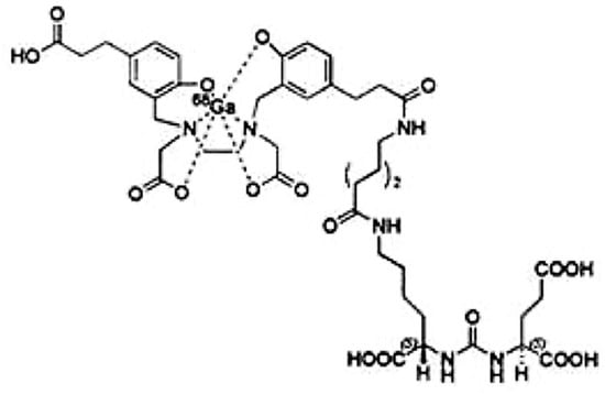 This pH constraint necessitates the use of chelators such as HBED-CC, a component of PSMA-11. It enables 68Ga to be complexed in a stable manner. PSMA-11 also includes a Lys-CO-Glu bonding unit for binding to PSMA. These two parts are linked by a 6-aminohexanoic acid, which provides sufficient separation to prevent interference with each other [,] (Figure 1).