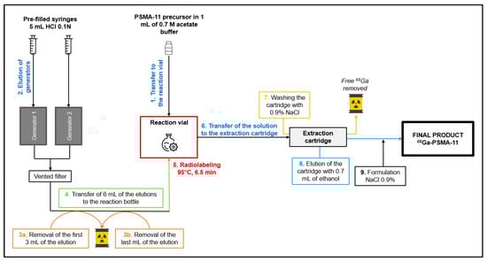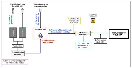 A cassette with prepurification is placed on the MiniAIO® synthesizer. An amount of 10 µg of PSMA-11 is reconstituted with 3 mL of sodium acetate buffer from Trasis® and then transferred into the reaction vial (step 1 in Figure 2). The elution of the two [68Ge]Ge/[68Ga]Ga generators is performed in parallel, using 5 mL of HCl 1M (2 mL/min) each. A female Luer lug style T and a ventilated filter are positioned at the outlet of the two generators (step 2). 68Ga solution is transferred to the prepurification cartridge which is eluted with 5 mL of a Suprapur® NaCl/HCl 30% mixture (step 3). The labeling reaction is performed at 95 ± 5 °C during 6.5 min (step 4). The solution is loaded onto an HLB cartridge to retain the [68Ga]Ga-PSMA-11. This cartridge is rinsed with 0.9% NaCl. The free 68Ga is evacuated in waste (steps 5 and 6). The cartridge is eluted with 0.7 mL of absolute ethanol, recovering the [68Ga]Ga-PSMA-11 (step 7). The solution is transferred to the final vial and, finally, formulated with 9.3 mL of 0.9% NaCl. Volume of the final product is 10 mL (step 8).