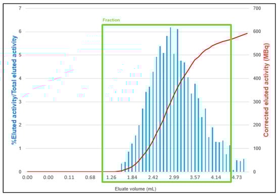 A cassette without prepurification is placed on the MiniAIO® synthesizer. An amount of 10 μg of PSMA-11 is reconstituted with 1 mL of 0.7 M sodium acetate solution, prepared, and filtered in radiopharmacy under laminar flow (ISO 5 from the NF EN ISO 14644-1 standard), and then transferred into the reaction vial (step 1 in Figure 3). The elution of the two [68Ge]Ge/[68Ga]Ga generators is performed in parallel, using 5 mL of HCl 1M (2 mL/min) each. A T device and a ventilated filter are positioned at the outlet of the two generators (step 2). The first 3 mL, i.e., 1,5 mL for each generator and the last 1 mL, i.e., 0,5 mL for each generator, of the elution are eliminated in waste (steps 3a and 3b). These volumes were established according to a study [] showing that fractionation of the elution from the [68Ge]Ge/[68Ga]Ga generators resulted in a higher activity volume. The following diagram from the study shows this result (Figure 4).