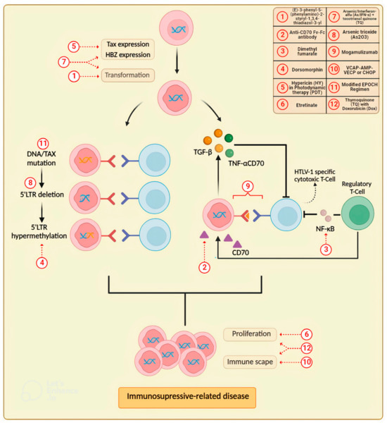 - Soltani, A.; Hashemy, S.I.; Zahedi, A.F.; Soleimani, A.; Rafatpanah, H.; Rezaee, S.A.; Griffith, R.; Mashkani, B. Molecular targeting for treatment of human T-lymphotropic virus type 1 infection. Biomed. Pharmacother. 2019, 109, 770–778. [Google Scholar] [CrossRef]