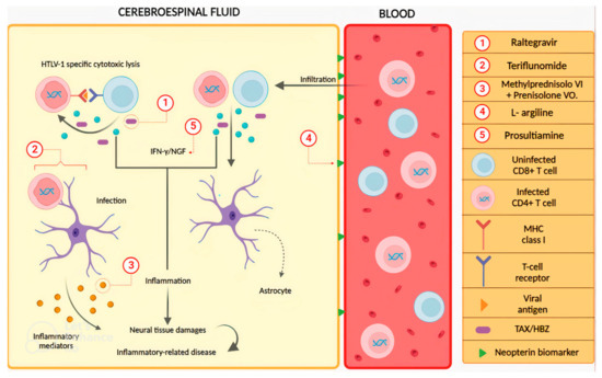 - Nakamura, T. HAM/TSP Pathogenesis: The Transmigration Activity of HTLV-1-Infected T Cells into Tissues. Pathogens 2023, 12, 492. [Google Scholar] [CrossRef] [PubMed]