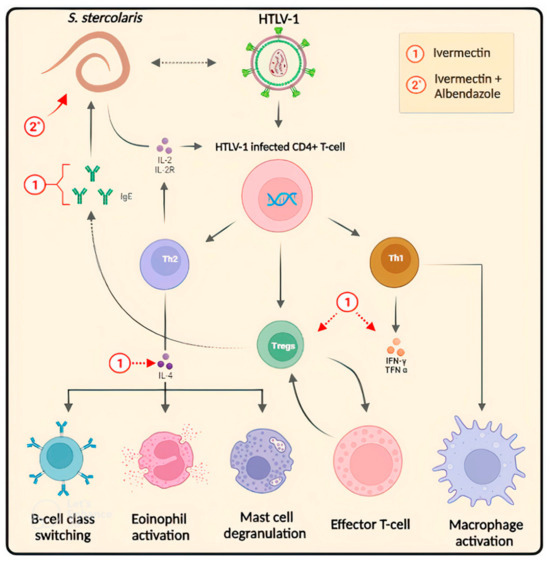 | Ivermectin 200 μg/kg | Treating strongyloidiasis infection decreases circulating Tregs, but antigen-specific cytokine remains altered. This may reflect the blunting of sensitization by Tregs. | Diagnosis of strongyloidiasis was made by stool examination using Baermann’s sedimentation method. All patients positive for Strongyoides larvae were tested for HTLV-1 infection by ELISA. Positive results were confirmed by Western blot. Then, patients received antihelminthic treatment with ivermectin 200 μg/kg dose on two consecutive days. A second course of two doses was given 15 days later. Clinical follow-up included the assessment of treatment efficacy by Baermann’s exam on stool. Then, flow cytometry and antigen-specific cytokine response tests were performed. | 2020 | [59] |