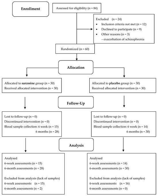 All enrolled patients were European Caucasians aged 18–60 years with a diagnosis of paranoid schizophrenia (295.30, according to DSM-IV, F20.0 according to ICD-10). Recruitment was conducted in our psychiatric outpatient clinic. Patients in stable physical, neurological and endocrine condition with laboratory values in the normal range (blood and biochemical tests including TSH, hepatic and renal parameters) and normal electrocardiogram were eligible for enrollment. After precise information about the aims and methods of the study and prior to all subsequent procedures, all eligible patients signed the informed consent form. After consent, they underwent a structured interview in accordance with the criteria of schizophrenia by ICD-10 and DSM-IV. One of the main inclusion criteria was the stability of the mental state and predominance of negative symptoms, with at least a 3-point score in each item in the PANSS negative symptoms subscale. Patients with symptoms of psychotic exacerbation, i.e., scoring more than 3 on one of the items in the positive symptoms subscale, were excluded from participation. To evaluate the influence of sarcosine precisely, we required 3-month-long treatment dosage stability before enrollment. Patients declaring suicide risk or taking clozapine (combining glutamatergic modulators such as glycine or sarcosine with clozapine was not effective or led to worsening of mental state by increasing positive symptoms) also did not enter the trial [43,44].