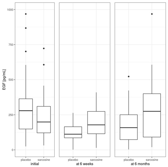 Figure 2 shows EGF levels in the study groups at three time points—initially, after six weeks and after six months. At the beginning of the study, EGF levels were comparable in both study groups (sarcosine: 235.1 ± 165.0 pg/mL, placebo: 315.5 ± 226.4 pg/mL, p = 0.2). There was a significant difference in EGF levels (sarcosine: 200.7 ± 117.9 pg/mL, placebo: 116.1 ± 72.6 pg/mL, p = 0.03) after six weeks, but not after six months (sarcosine: 288.1 ± 231.3 pg/mL, placebo: 182.1 ± 135.8 pg/mL, p = 0.1).