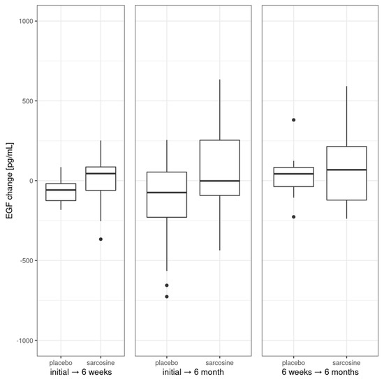 However, observations on EGF concentrations in the sarcosine and placebo groups may indicate that the neuroprotective effect of sarcosine (by normalizing glutamatergic transmission and reducing its excitotoxic effects) may induce EGF production or inhibit the decline in EGF concentrations that progressed in the placebo group. EGF is probably the only growth factor that also has neuroprotective effects—protecting dopaminergic neurons from the excitotoxic effects of elevated glutamate concentrations [31,32] and inducing reparative processes [27,33,34,35]. Morphological changes induced by susceptibility to schizophrenia, as well as toxic processes in the course of acute psychosis, have a particularly negative impact on the increasing level of negative symptoms and cognitive dysfunctions [36,37,38]. In schizophrenia, GlyT1 blockade on GABAergic neurons prevents glutamatergic excitotoxicity, i.e., sarcosine can block neuronal and glial damage/dysfunction, which can also prevent EGF decline [39]. The bioavailability of EGF in the brain is ensured by production in glial cells and neurons and by uptake from the peripheral circulation [3], indicating that peripheral concentrations may be somewhat related to levels within the brain, but this is not described in detail yet. It may, of course, affect the interpretation of our results, especially since EGF is not specific to neural tissue and is found, for example, in the skin, salivary glands and platelets [40,41].