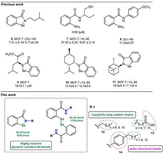 In our previous work, we have modified the primary benzisoselenazolone core by attaching different moieties to the nitrogen atom, e.g., alkyl 6, 7, aryl 8, chiral terpenyl 9, 10 and aminoacid 11 substituents [18,19,20,21]. The antiproliferative activity of all compounds was evaluated, revealing promising anticancer potential. In this paper, we aimed to evaluate the influence of long carbon chains on the antioxidant and cytotoxic activity of N-functionalized benzisoselenazolones, by their direct attachment to the nitrogen atom 12, through a phenyl ring as a linker 13 and with additional ester termination at the end of the chain 14. The obtained compounds were also synthesized in the form of corresponding diselenides to check the reactivity for Se-functionalities with different bond energies (Se-Se 172 kJ/mol, Se-N bond 193 kJ/mol) [22,23] (Figure 2).
