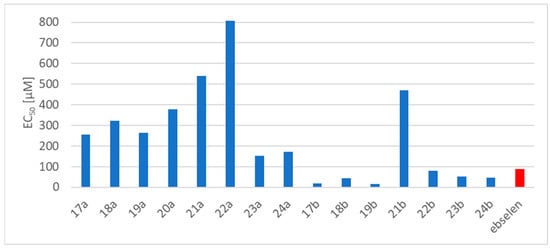 In the case of diselenides 17b–24b, the values of RSA were better or on a comparable level compared to ebselen, except 21b (Figure 3). The latter suggests that the presence of an additional phenyl ring does not improve the discussed properties of the obtained compounds and aligns with the results obtained for benzisoselenazolones 17a–24a.