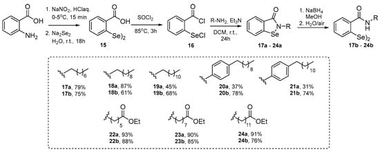 The first stage of the research involved the synthesis of N-functionalized benzisoselenazol-3(2H)-ones 17a–24a and corresponding diselenides 17b–24b. First, compounds 17a–24a were obtained in the reaction of 2-(chloroseleno)benzoyl chloride 16, synthesized from anthranilic acid 15 according to our previously reported method [19], with appropriate primary amines, mostly commercially available. Only in the case of products 22a–24a and 22b–24b the substrate ester amines had to be synthesized from corresponding carboxylic acids by the treatment with thionyl chloride and ethyl iodide. Next, the obtained benzisoselenazolones 17a–24a were transformed to diselenides 17b–24b by a sodium borohydride reduction and air oxidation method. All obtained compounds were synthesized in good yields (45–93%) [21] (Scheme 1).