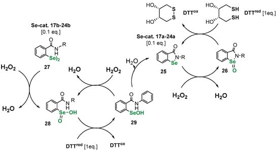 The antioxidant activity of all Se-derivatives was evaluated by two assays. First, by the procedure based on the oxidation of dithiol to disulfide presented by Iwaoka and co-workers [29]. The evaluation starts from the reduction of hydrogen peroxide to water with simultaneous activation of the pre-catalyst: benzisoselenazolone 25 to selenooxide 26 or diselenide 27 to seleninic acid 28. The activated compounds 26 or 28 further transform the dithiol DTTred to the disulfide DTTox. Catalyst 28 can be additionally regenerated from compound 29 by reducing an additional H2O2 molecule (Scheme 2). The progress of the process is monitored by 1H NMR spectra, recorded in specific time intervals. The results collected for each Se-catalyst 17a–24a or 17b–24b are presented in Table 1.