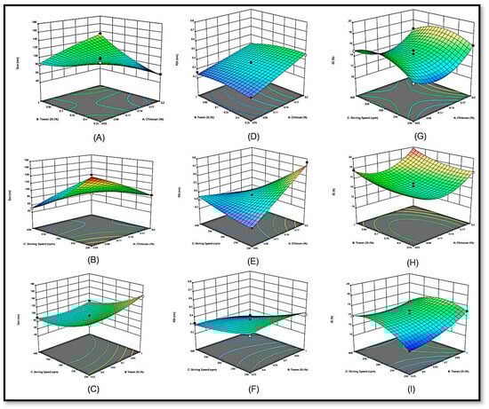3D response surface plot showing the effect of independent variables on particle size (Y1) (A–C), polydispersity index (Y2) (D–F) and entrapment efficiency (Y3) (G–I).