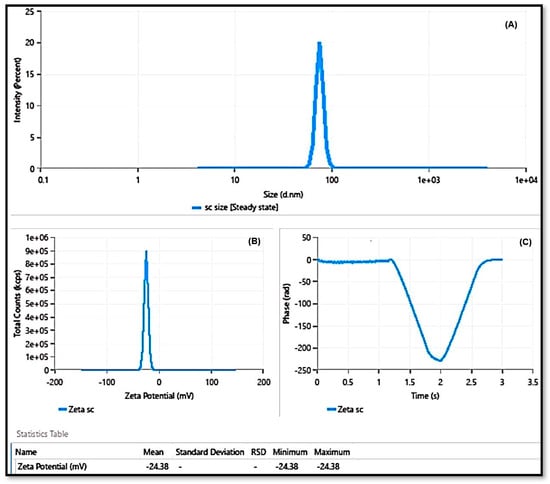 Particle size of SCHA-CS-NPs (A); zeta potential of SCHA extract-loaded chitosan nanoparticles (B); and phase–time plot of SCHA extract-loaded chitosan nanoparticles (C).