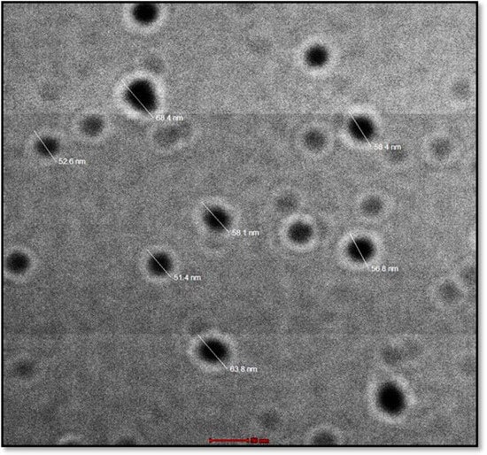 The morphology of the SCHA-CS-NP was analyzed using TEM. The results showed spherical structures of size 57.4 nm, consistent with the DLS results (Figure 5). The size of the NPs was 5 nm, as observed in previous studies on green synthesized NPs using Sida cordifolia plant extract in its aqueous form []. Similarly, another study reported an asymmetrical NP structure with an average size of 16 nm when α-Fe2O3 NPs were prepared using Sida cordifolia extract []. However, when silver NPs were prepared with Sida cordifolia extract, the TEM images revealed sizes from 10 to 30 nm []. Notably, all these studies used Sida cordifolia in its extract form with other compounds; therefore, the sizes may have varied.