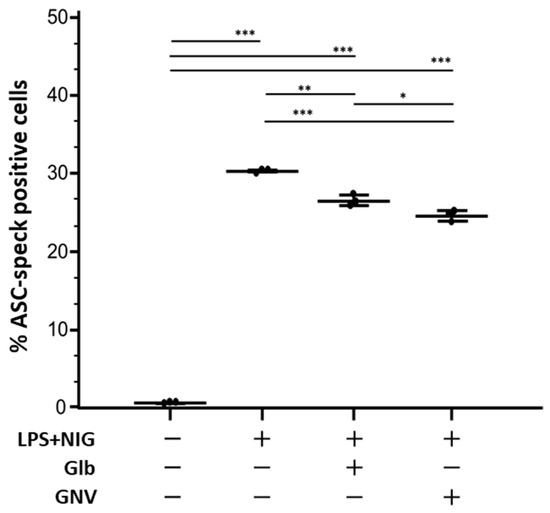 The percentage of ASC-speck positive cells in THP-1 DMs stimulated in the presence of GNVs (mean: 24.9%) or Glb (26.2%) was significantly reduced compared to that observed in LPS+nigericine-activated THP-1 DMs cultured in medium alone (median: 30.8%; p < 0.001 for both comparisons) (Figure 1). Representative dot plot and images of ASC-speck formation are shown in Supplementary Materials, Figure S1.