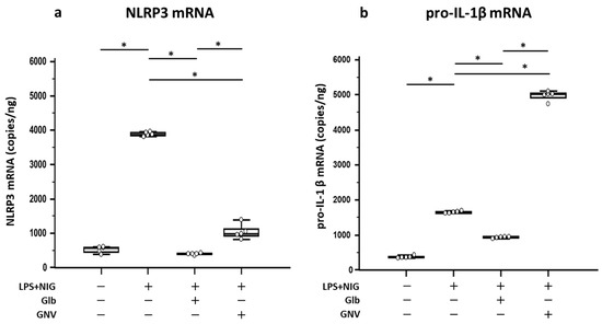 NLRP3 and pro-IL-1β mRNA expression. (a) NLRP3 gene expression in THP-1 DMs. NLRP3 mRNA expression in unstimulated or LPS+nigericine (NIG)-stimulated THP-1 DMs in presence/absence of glibenclamide (Glb) or glibenclamide-loaded nanovectors (GNVs). Data are expressed as copies/ng. Graph shows median values and interquartile range (25th–75th percentiles) obtained from three independent experiments. Statistical significance is shown: * = p ≤ 0.01. For additional details, see Section 4. (b) pro-IL-1β mRNA expression in THP-1 DMs that were cultured in medium alone or LPS+nigericine (NIG) activated in the presence/absence of glibenclamide (Glb) or glibenclamide-loaded nanovectors (GNVs). Data are expressed as copies/ng; graph represents median values and interquartile range (25th–75th percentiles). Statistical significance is shown: * = p ≤ 0.01.