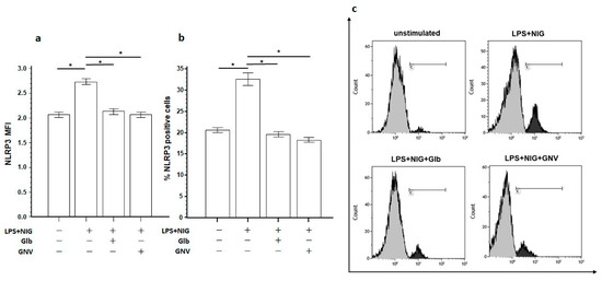 In the next series of experiments, NLRP3-specific mRNA expression was evaluated in THP-1 DMs after 1 h of stimulation with LPS+nigericine in the presence/absence of GNVs or Glb. The results shown in Figure 3a confirmed that both agents result in a significant reduction in NLRP3 transcription; remarkably, neither GNVs nor Glb alone had any effect on NLRP3 expression in unstimulated cells. All these data are summarized in Supplementary Materials, Table S1.