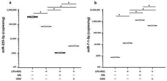 Effect of GNVs on miR-223-3p and miR-7-1-5p expression. Expression (as copies/ng) of miR-223-3p (a) and miR-7-1-5p (b) measured by ddPCR in THP-1 DMs cultured in medium alone or stimulated with LPS+nigericine (NIG) in presence/absence of glibenclamide (Glb) or glibenclamide-loaded nanovectors (GNVs). Graphs represent median values and interquartile range (25th–75th percentiles) obtained from three independent experiments. Statistical significance is shown: * = p 0.01. For additional details, see Section 4.