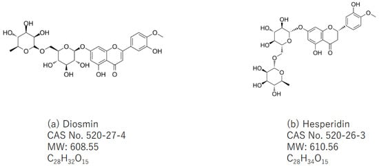 Chemical structures of (a) diosmin (CAS No. 520-27-4, MW: 608.55, C28H32O15) and (b) hesperidin (CAS No. 520-26-3, MW: 610.56, C28H34O15).