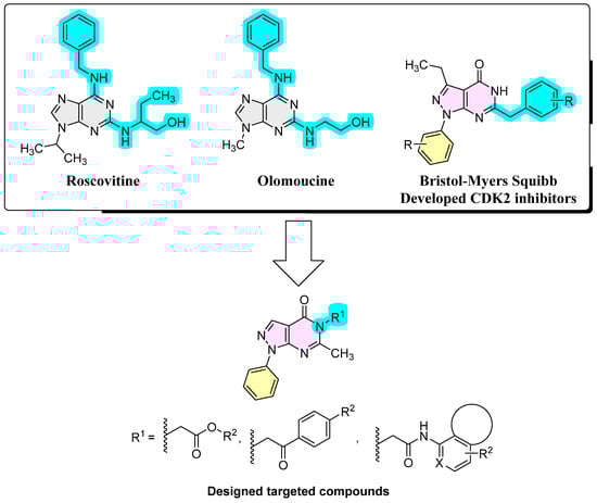 Cyclin-dependent kinase-2 (CDK2) requires, in addition to cyclin, the adenosine triphosphate (ATP) molecule to function. Knowing that ATP incorporates adenine which is a purine base, it might not be surprising that purine and purine isosteres serve as scaffolds to develop CDK2 inhibitors. Thus, roscovitine and olomoucine (Figure 1) were developed as purine based CDK2 inhibitors [24]. While roscovitine and olomoucine are 4,6-disubstituted purine derivatives, Bristol–Myers Squibb has developed 6-substituted-pyrazolo[3,4-d]pyrimidinones with a purine isostere scaffold, as CDK2 inhibitors [25]. Exploration of positional isomers is one of the most well-known drug design strategies and a powerful lead generation method that can yield new chemical entities of promising activity [26,27,28]. While 4,6-disubstituted purine derivatives and 6-substituted-pyrazolo[3,4-d]pyrimidinones as CDK2 inhibitors are reported, N5-substituted-pyrazolo[3,4-d]pyrimidinones, to the best of our knowledge, have not been explored as potential CDK2 inhibitors [29,30,31]. Considering these data and motivated by the positional isomerism strategy in generating new promising bioactive compounds, new derivatives of N5-substituted-pyrazolo[3,4-d]pyrimidinones were designed as antiproliferative CDK2 inhibitors against HCC and CRC. As shown in Figure 1, the compounds designed maintained the N1-aryl substituent existing in Bristol–Myers Squibb-developed compounds but introduced diverse N5-substituents at the pyrazolo[3,4-d]pyrimidinone scaffold while substituents at the 6-position were trimmed, leaving only the small methyl fragment at the 6-position. In the move towards a more efficient exploration of the chemical space around N5-substituents, diverse substituents were considered involving variable alkyl, acetyl esters, phenacyl or acetamide moieties with diverse substituents and/or stereoelectronic features. Herein, we report our interesting results of the designed compounds.