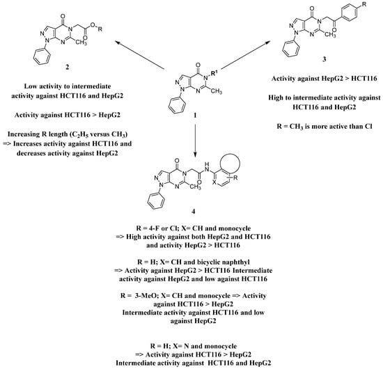 Analysis of the structure-activity relationship of the evaluated compounds highlighted some possible key points (Figure 2). First, incorporation of an aromatic moiety within the introduced N5-subtituent was essential for bioactivity while aliphatic N5-subtituents free from aromatic moieties such as acetate ester derivatives 2 were not optimal for activity. The increase in alkyl ester length enhanced anti-HCT116 activity but was detrimental to anti-HepG2 activity. Such aliphatic derivatives were more active against HCT116 cells. Switching the N5-subtitution pattern to an aromatic moiety-containing phenacyl derivative 3 resulted in reversing the activity pattern where these compounds were more active against HepG2 than HCT116. Particularly, the N5-(4-methylphenacyl) derivative 3b showed a potential IC50 of 1.90 µM against HepG2, which is seven-fold the potency of roscovitine. Increasing the distance of between the aromatic moiety and the N5-atom by one atom through the insertion of a nitrogen atom to convert phenacyl derivatives into N5-acetamide derivatives 4 resulted in mixed results depending on the aromatic moiety and the substitution pattern on it. When the aromatic moiety was a bicyclic unsubstituted 1-naphthyl moiety (compound 4e), the activity pattern was maintained but the potency was not high. Not only was this activity pattern maintained upon using the monocyclic 4-halophenyl as the aromatic moiety in N5-acetamide derivatives 4a and 4b, highly active compounds were also obtained. Specifically, incorporation of the more electronegative 4-fluoro substituent (compound 4a) afforded a more potent compound than the corresponding 4-chloro derivative (compound 4b). Replacing the electronegative 4-halosusbtituent by the electron-donating 3-methoxy substituent (compound 4c) resulted in lower activity and showed an activity trend opposite to compounds 4a and 4b in which compounds were more active against HCT116 than HepG2. Likewise, incorporation of the electron deficient pyridyl ring as the aromatic moiety showed the opposite activity trend in which compounds were more active against HCT116 than HepG2 but did not improve the activity. In summary, incorporation of the aromatic 4-susbituted-phenyl moiety in the N5-susbtituent resulted in activity enhancement affording the most active compounds.