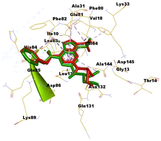 Superimposition of the original pose of roscovitine (green) and the redocked pose (red) into the substrate pocket of CDK2.