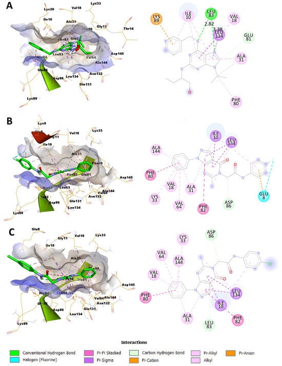 Exploration of the binding mode of roscovitine with its binding pocket unveiled that it could form various interactions with different amino acid residues within the ATP binding region of the enzyme including the three important amino acids (Ile10, Leu83, and Leu134) (Figure 4A, Table 3). It was capable of establishing two hydrogen bonds with the Leu83 amino acid residue via the N-atom of its purine ring system and NH of the benzyl amino side chain. The lengths of these two hydrogen bonds were 2.82 and 3.38 Å, respectively (Figure 4A, Table 3). Also, two π–sigma interactions were observed between Leu134 and the purine ring. The phenyl ring of the benzyl amino side chain formed a π–cation interaction with Lys89. In addition, various hydrophobic C–-H, π–alkyl, and alkyl interactions were established with amino acid residues within the binding site (Ile10, Val18, Ala31, Phe80, and Glu81). Compound 4a was docked successfully into the ATP-binding site with a binding energy score of −7.0394 Kcal/mol (Figure 4B, Table 3), which was comparable to that of roscovitine which was −7.8236 Kcal/mol. It was able to establish a network of interactions including a halogen (fluorine) bond between its 4-fluoro substituent on the N-phenylacetamide moiety and Glu8. Moreover, the phenyl ring of the phenylacetamide side chain formed a π–anion interaction with Glu8. Furthermore, three π–sigma interactions were observed between Ile10 and Leu134, and the pyrazolo[3,4-d]pyrimidine ring. Additionally, various hydrophobic C–H, π–π stacked, π–alkyl, and alkyl interactions were established with amino acid residues within the binding site (Ile10, Val18, Ala31, Leu134, Ala144, Asp86, Lys33, Val64, Phe80, and Phe82). On the other hand, compound 4b was docked to CDK2 with an acceptable binding energy score of −7.0358 Kcal/mol. Again, this docking score was comparable to that of the reference molecule, roscovitine. Interestingly, 4b was able to establish the same interactions with the binding site as 4a except the halogen and π–anion bonding with Glu8 (Figure 4C, Table 3). These results agreed with the biological and biochemical assays where compounds 4a and 4b were expected to dock successfully into the ATP-binding site of CDK2 and were able to interact with the essential amino acid residues within the binding site. Compound 4a formed additional halogen and π–anion bonds with Glu8, illustrating that it might be beneficial to its binding process. This might be the reason why it possesses higher CDK2 inhibitory activity.