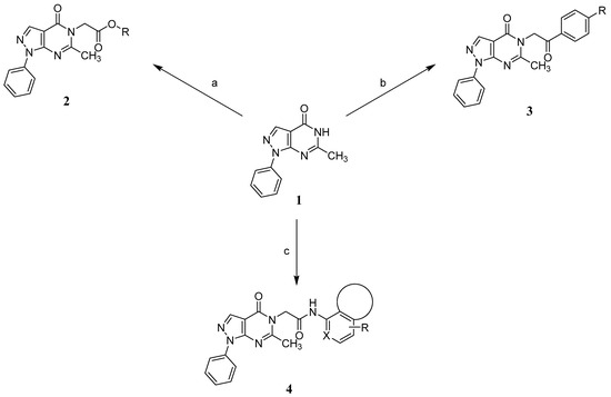 A concise synthesis of the targeted compounds was achieved in one single step starting from the reported 1,5-dihydro-4H-pyrazolo[3,4-d]pyrimidin-4-one derivative 1 [32]. As shown in Scheme 1, N5-alkylation using the appropriate halo derivative in the presence of a potassium carbonate/DMF system directly afforded the corresponding targeted compounds. Thus, heating a mixture of compound 1 with the appropriate 2-chloroacetate ester derivative in the presence of a potassium carbonate/DMF system afforded the desired derivative 2 at a 75% yield. Similarly, heating a mixture of compound 1 with the appropriate 2-bromoacertophenone derivative in the presence of a potassium carbonate/DMF system afforded the desired derivative 3 at 62–65% yields. Likewise, heating a mixture of compound 1 with the appropriate 2-chloroacetamide derivative in the presence of a potassium carbonate/DMF system afforded the desired derivative 4 at 60–70% yields.